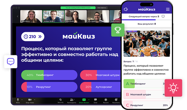 - Викторина с вопросами о вашей компании (или другую тему) развлекает, создает игровую конкуренцию и обучает коллег